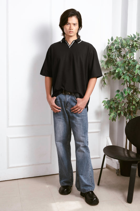 Knitted Open Collar Polo Shirt - Black